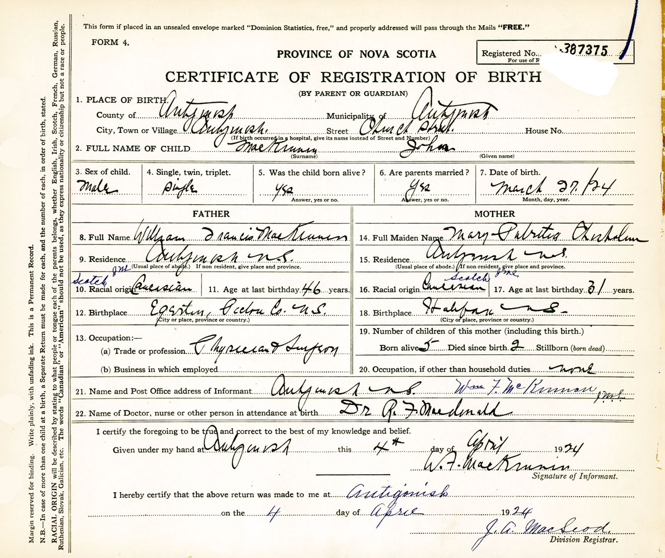 Male Birth Registration: Year: 1924 number: 38700375
