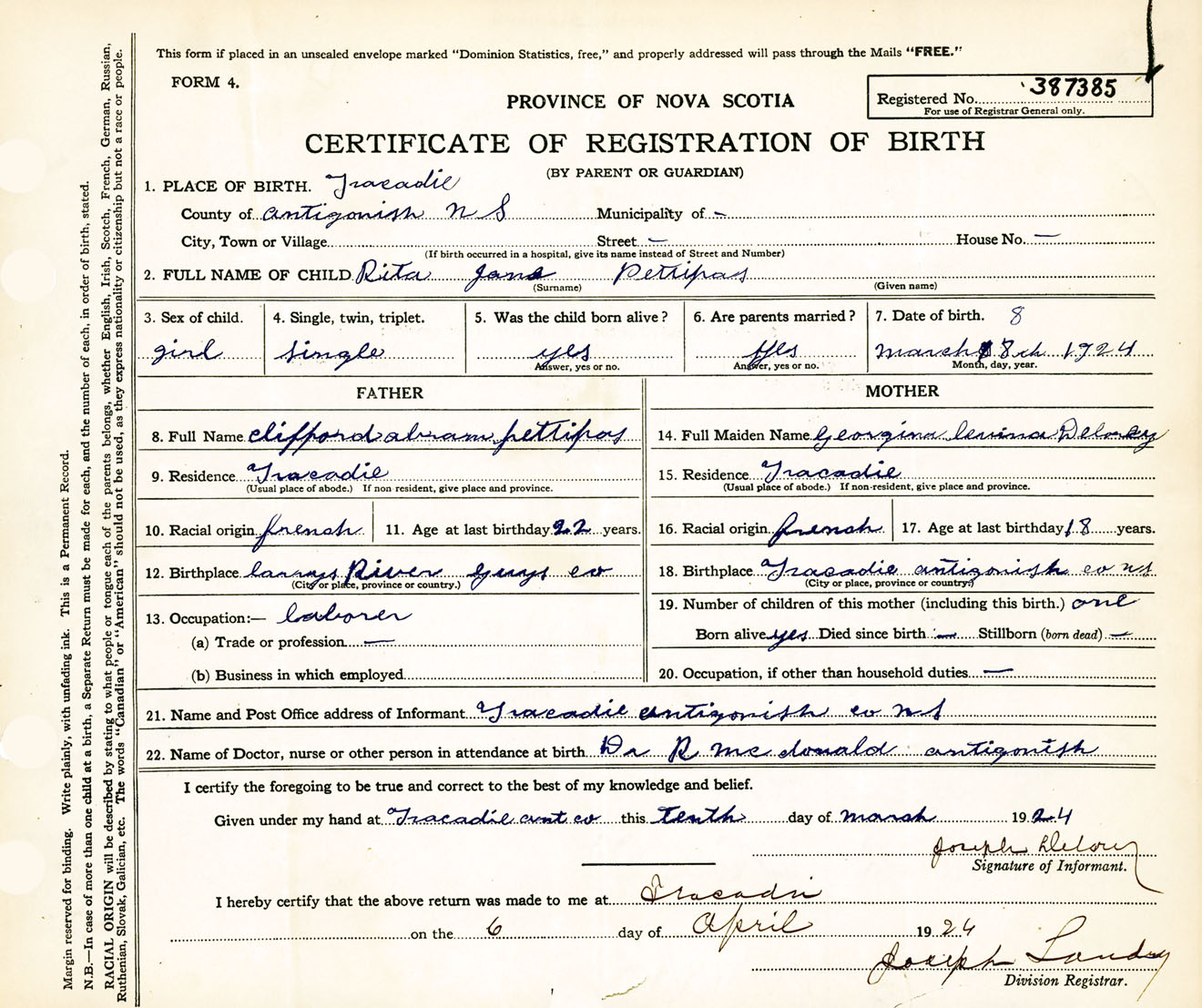 Female Birth Registration: Year: 1924 number: 38700385