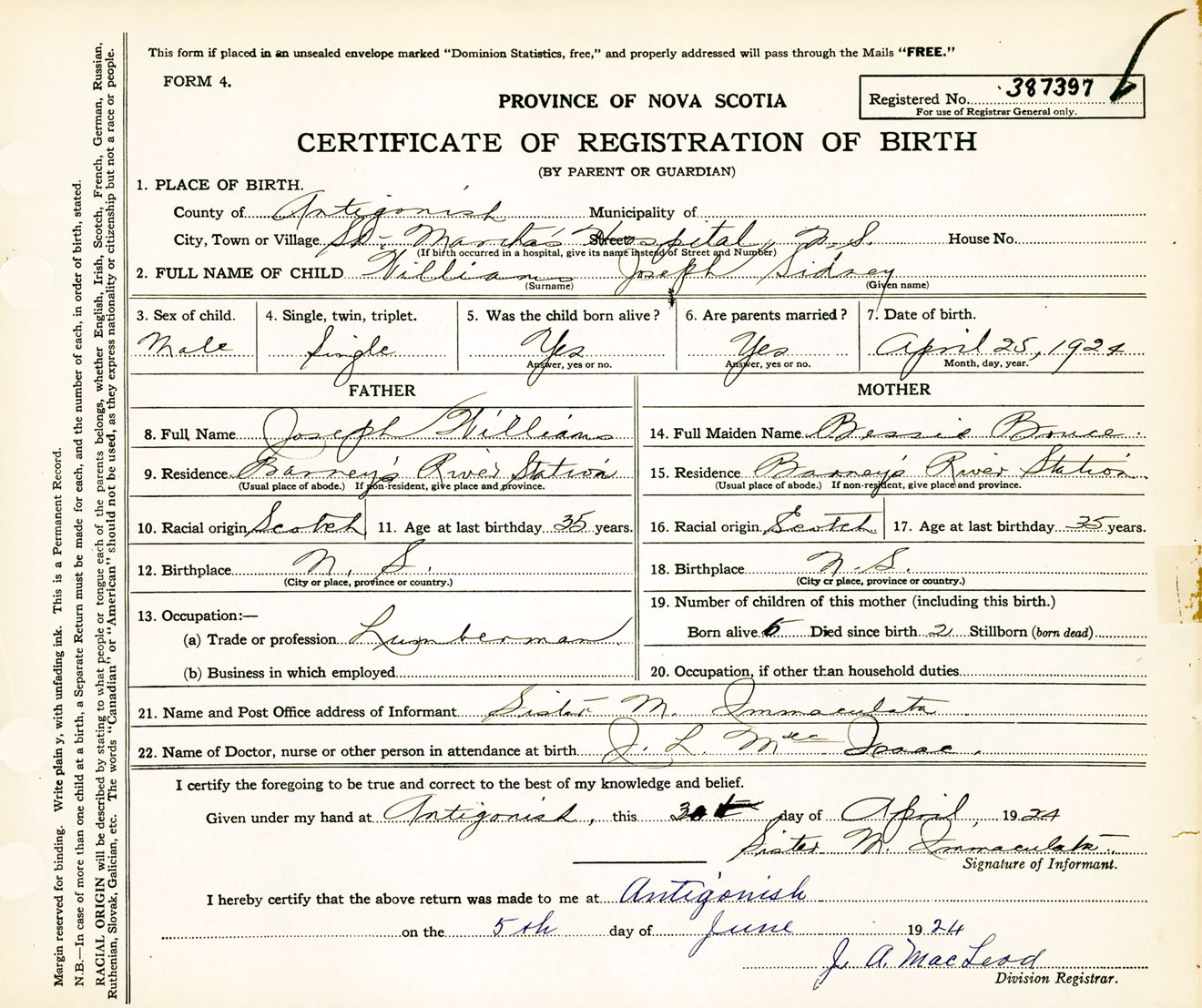 Male Birth Registration: Year: 1924 number: 38700397