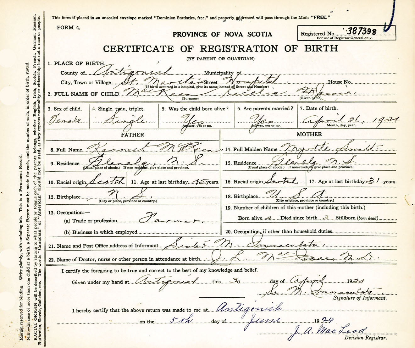Female Birth Registration: Year: 1924 number: 38700398
