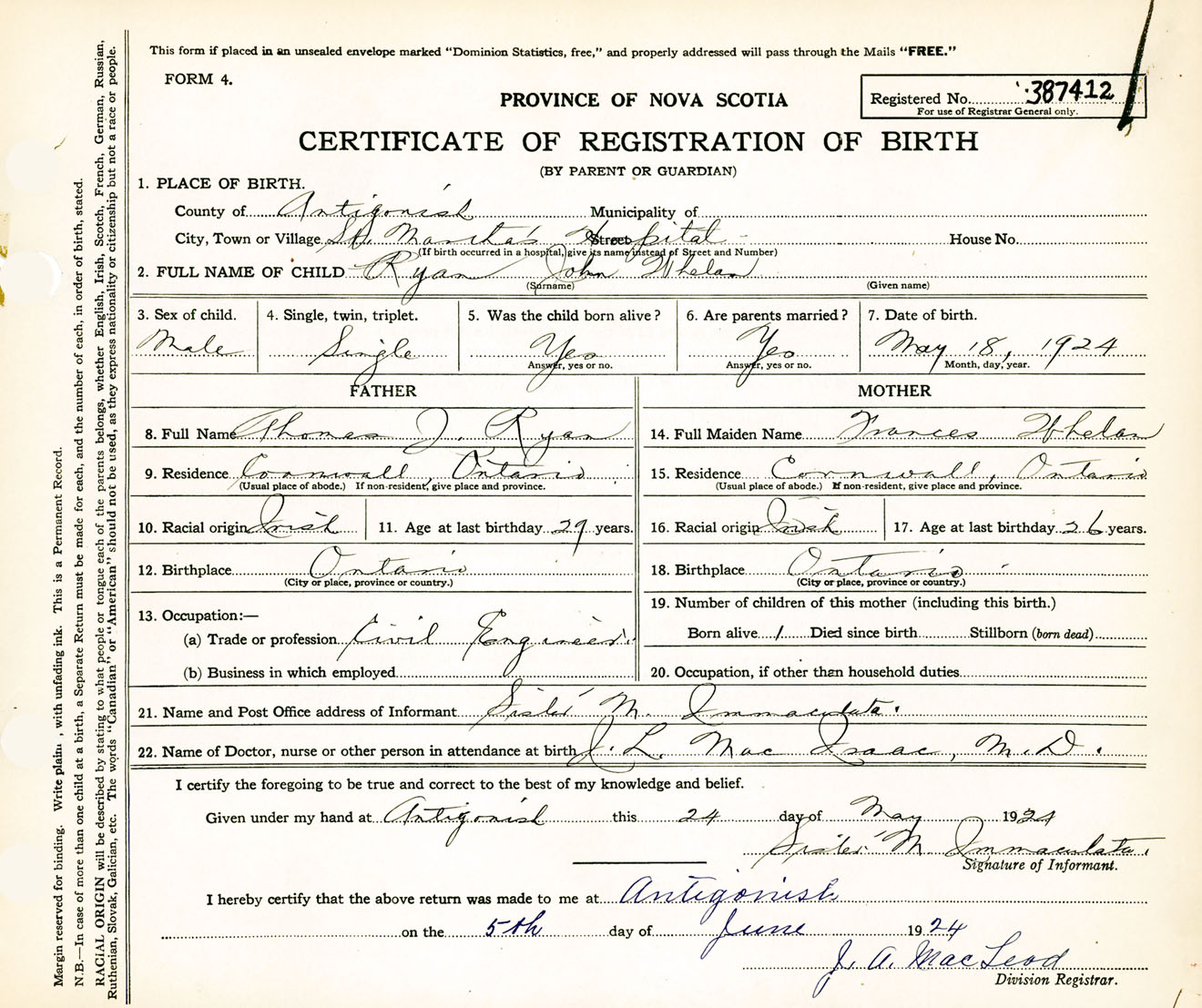 Male Birth Registration: Year: 1924 number: 38700412