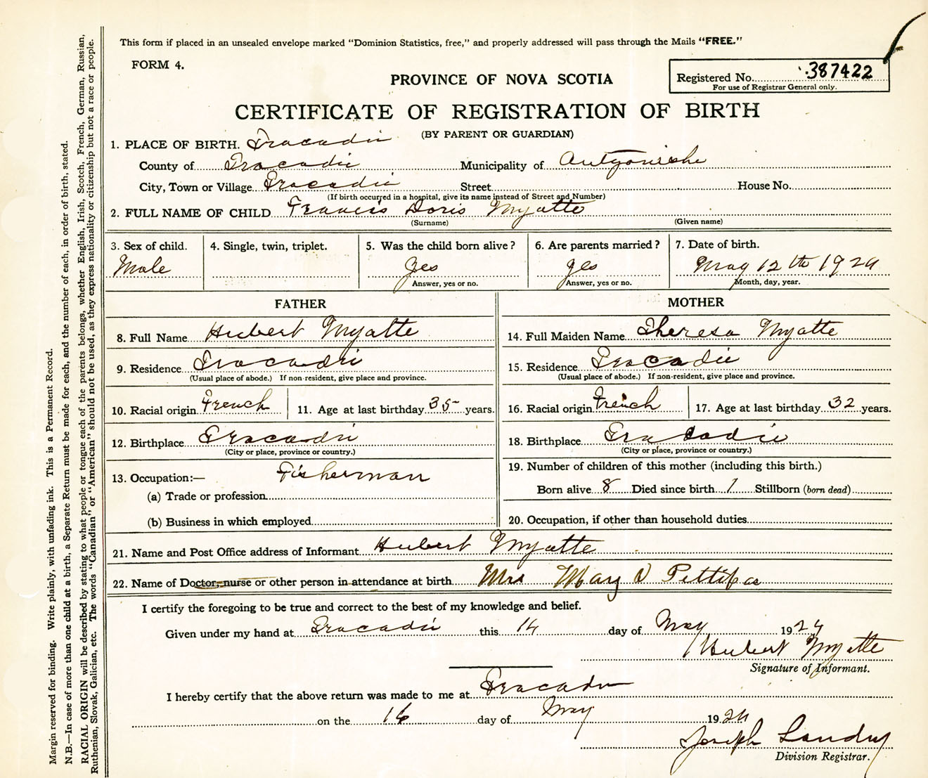Male Birth Registration: Year: 1924 number: 38700422
