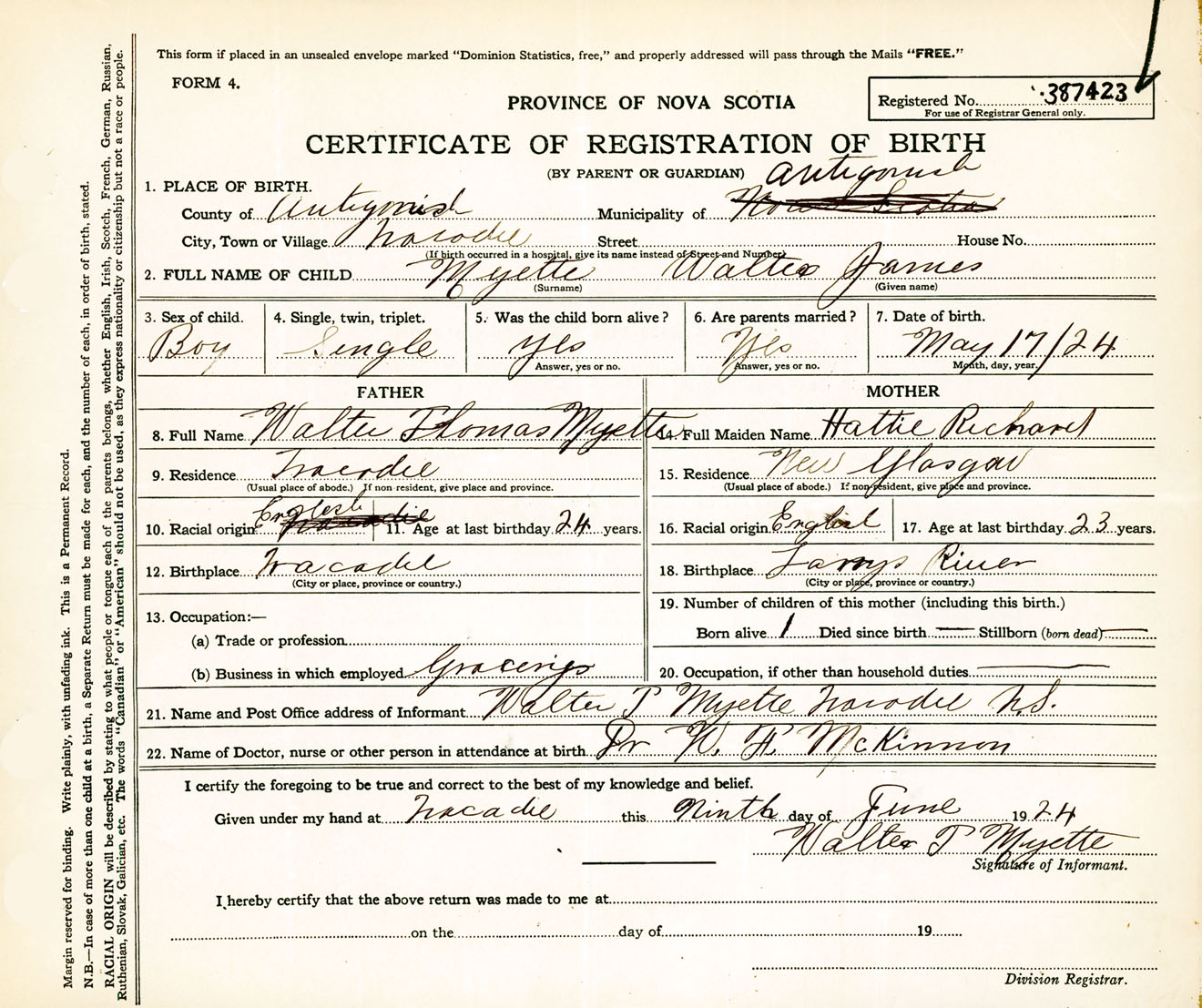 Male Birth Registration: Year: 1924 number: 38700423