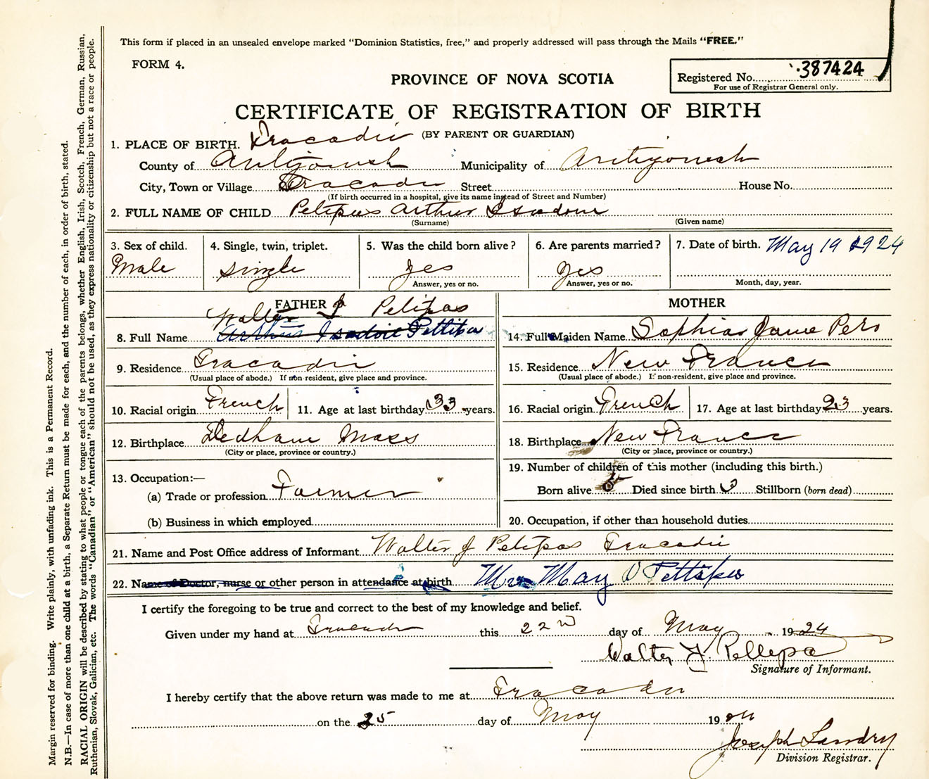 Male Birth Registration: Year: 1924 number: 38700424