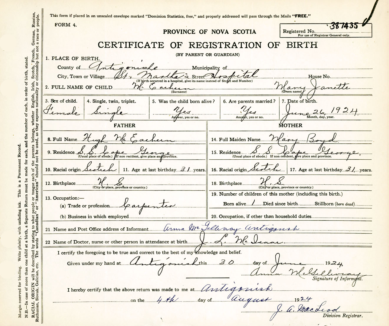 Female Birth Registration: Year: 1924 number: 38700435