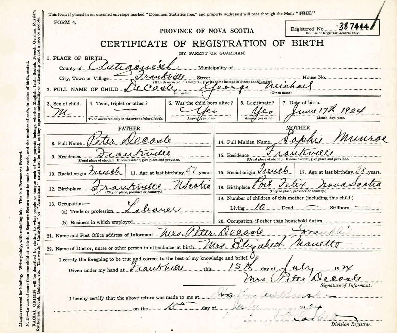 Male Birth Registration: Year: 1924 number: 38700444