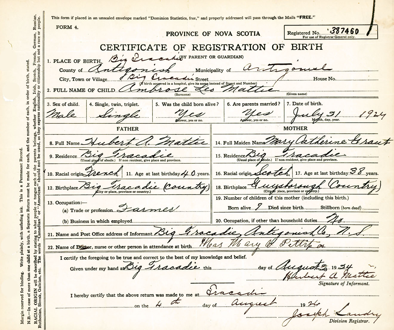 Male Birth Registration: Year: 1924 number: 38700460