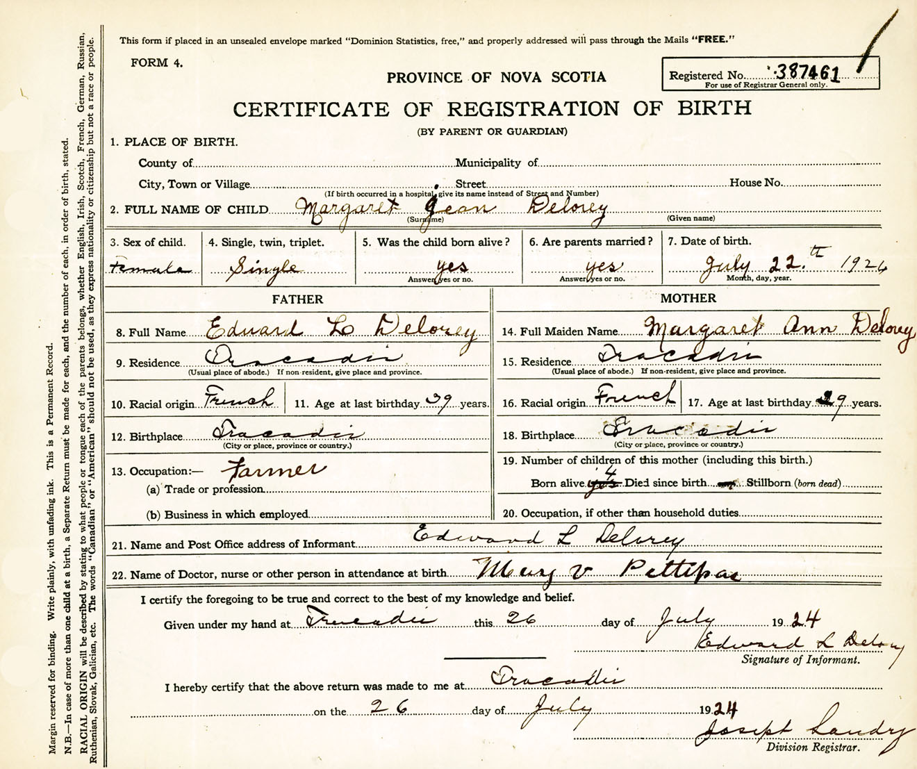 Female Birth Registration: Year: 1924 number: 38700461