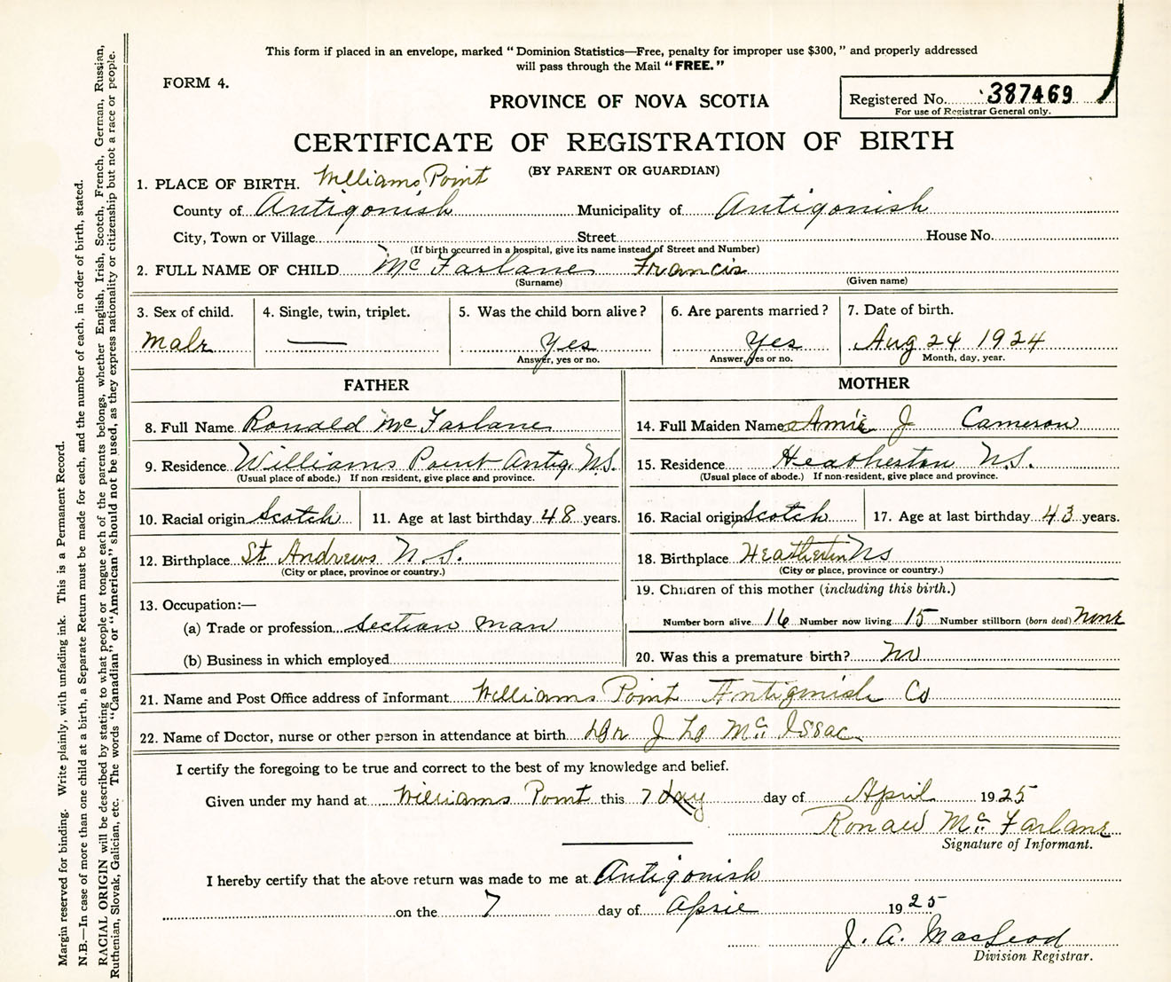 Male Birth Registration: Year: 1924 number: 38700469