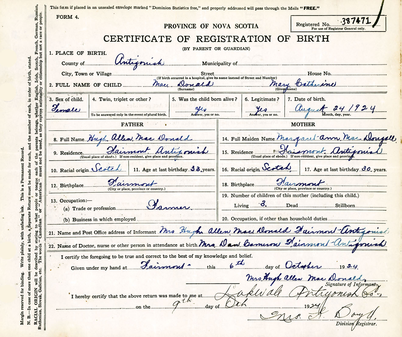 Female Birth Registration: Year: 1924 number: 38700471