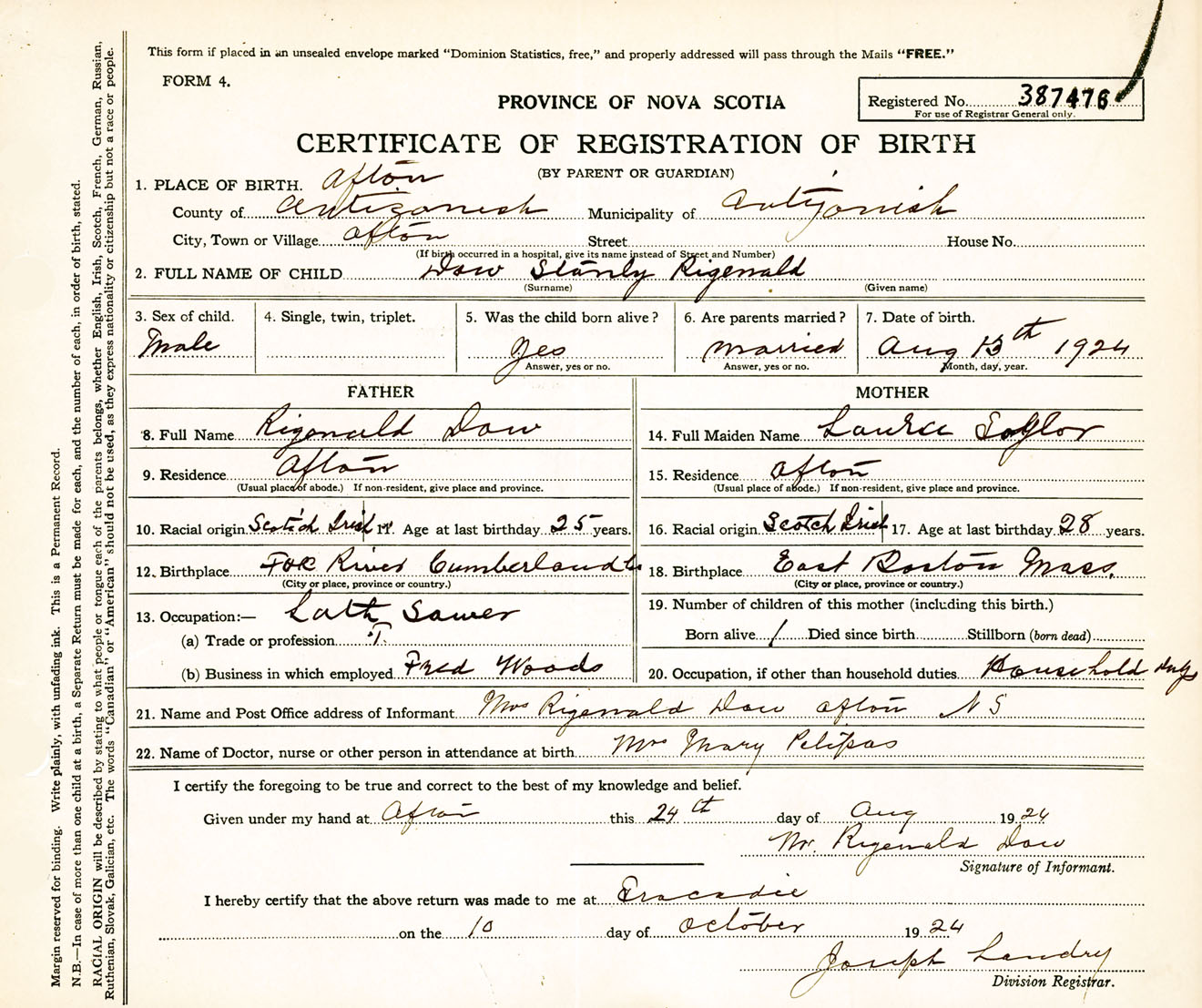 Male Birth Registration: Year: 1924 number: 38700476