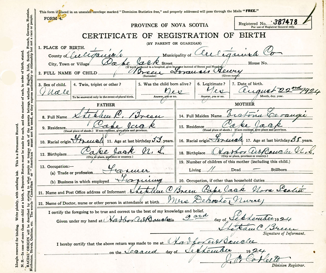 Male Birth Registration: Year: 1924 number: 38700478