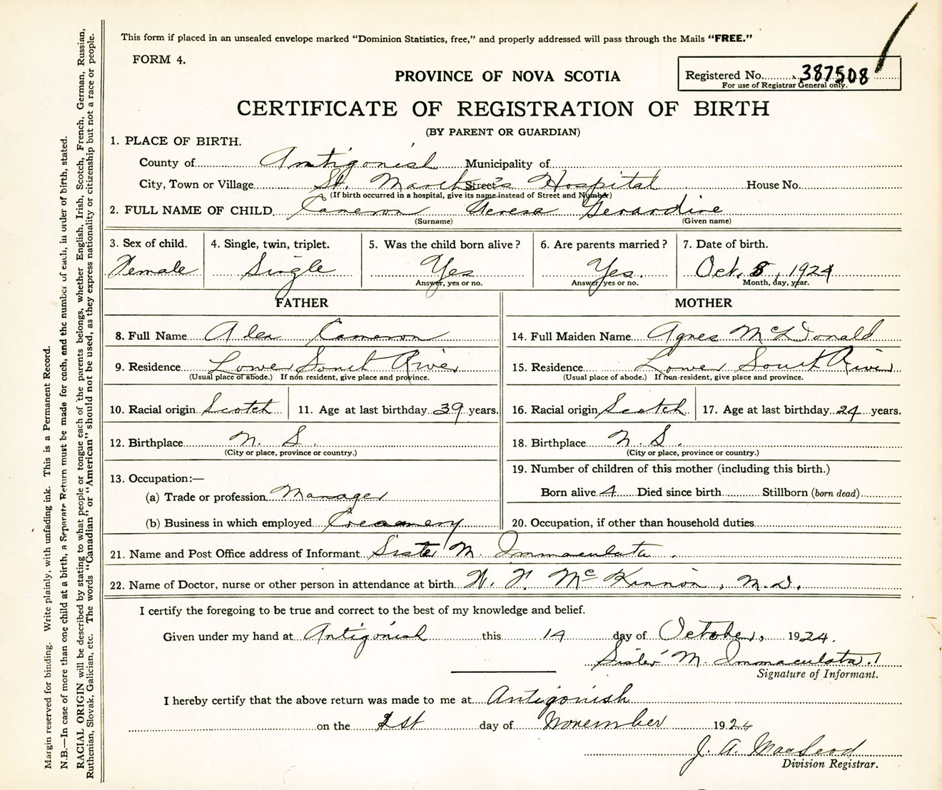 Female Birth Registration: Year: 1924 number: 38700508