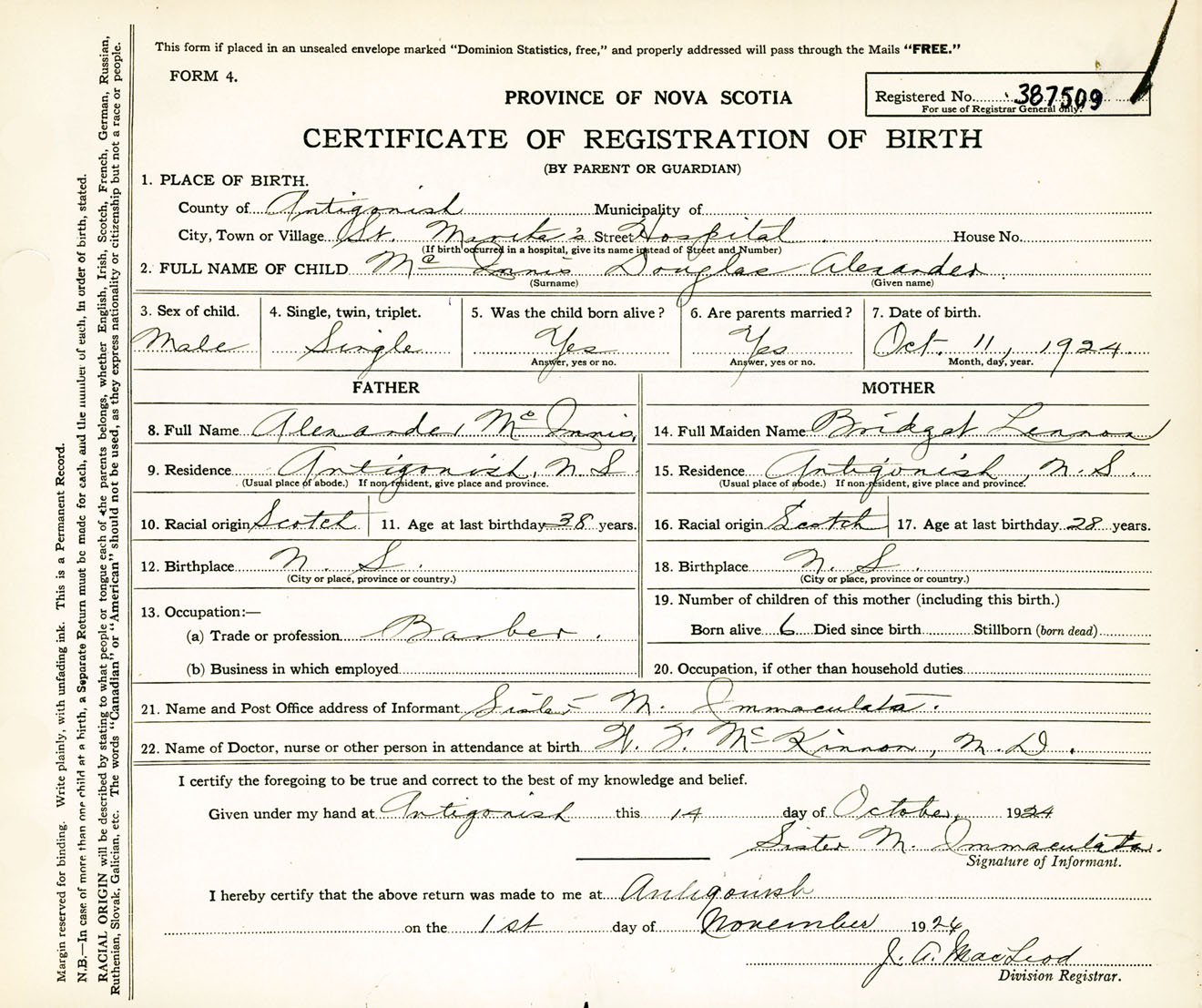Male Birth Registration: Year: 1924 number: 38700509