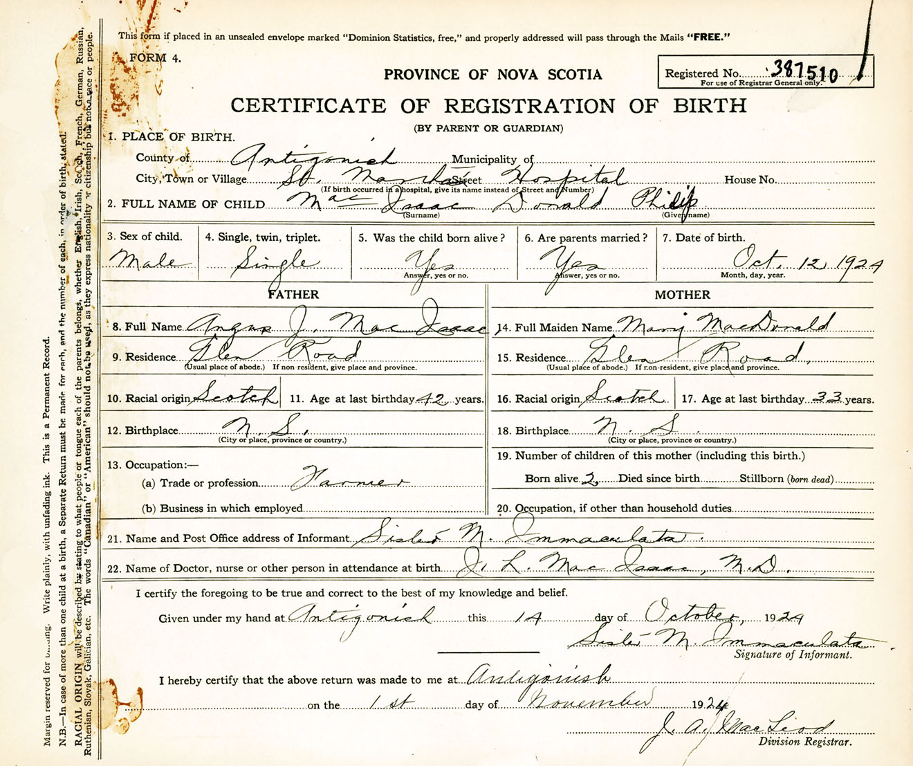 Male Birth Registration: Year: 1924 number: 38700510