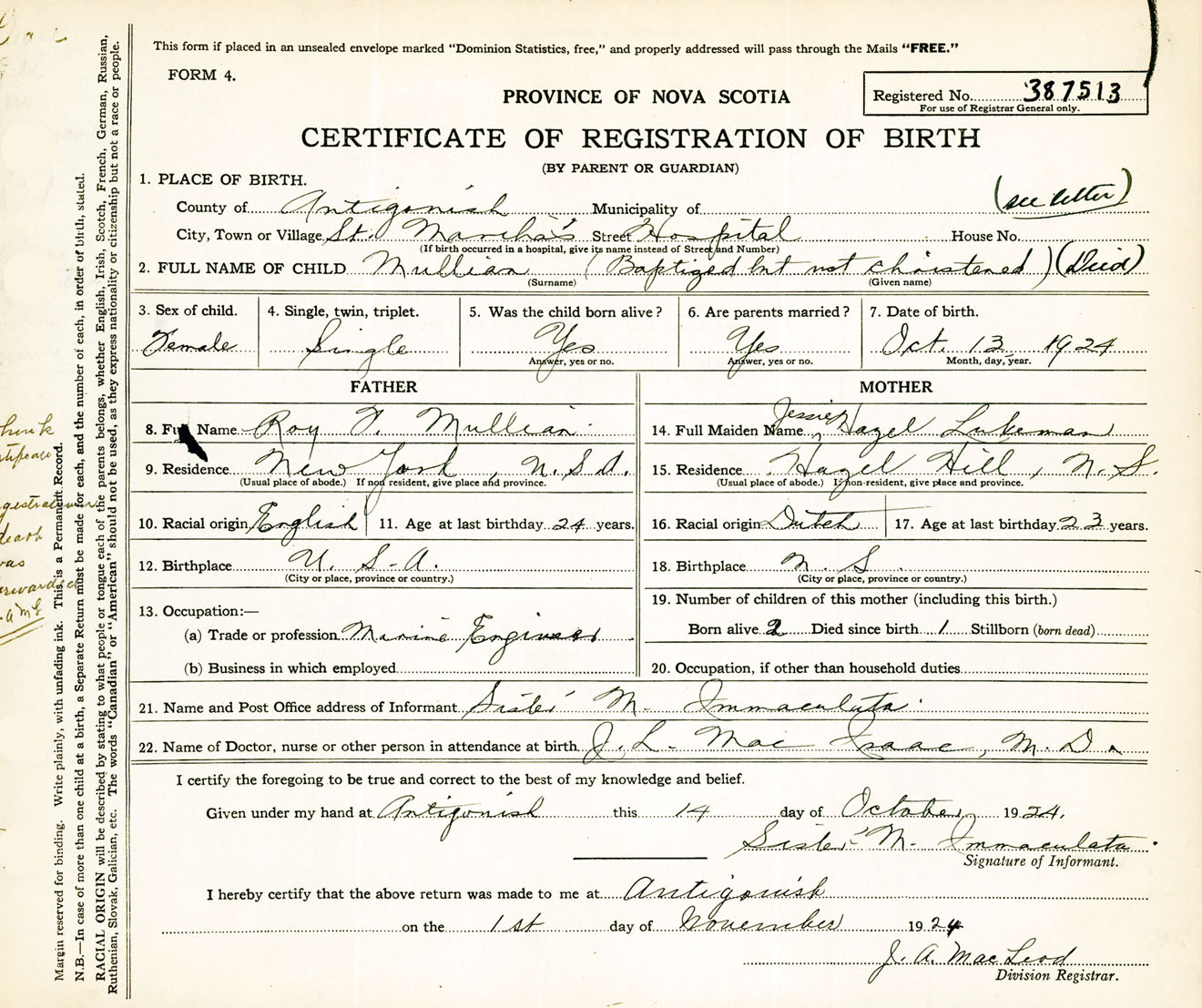 Female Birth Registration: Year: 1924 number: 38700513
