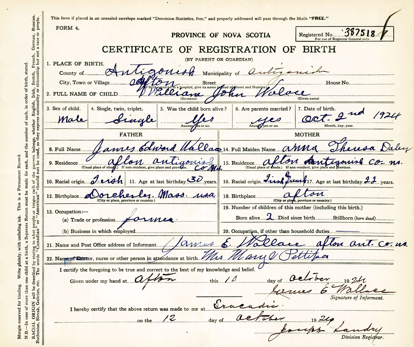 Male Birth Registration: Year: 1924 number: 38700518