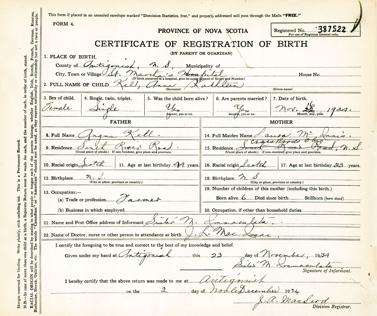 Female Birth Registration: Year: 1924 number: 38700522