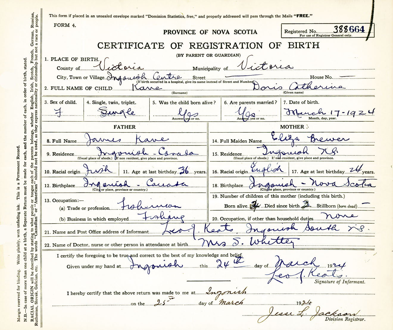 Female Birth Registration: Year: 1924 number: 38800664