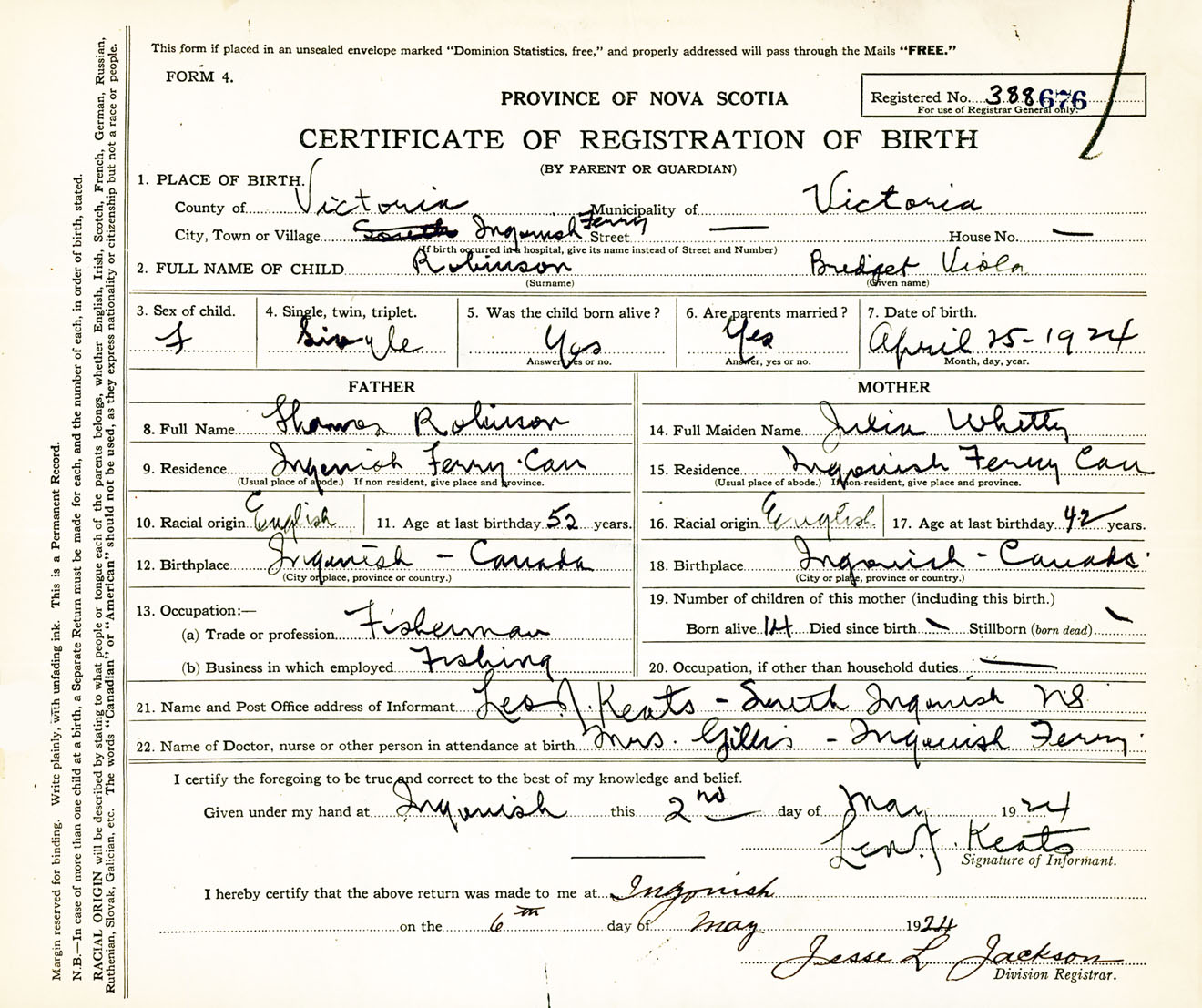 Female Birth Registration: Year: 1924 number: 38800676