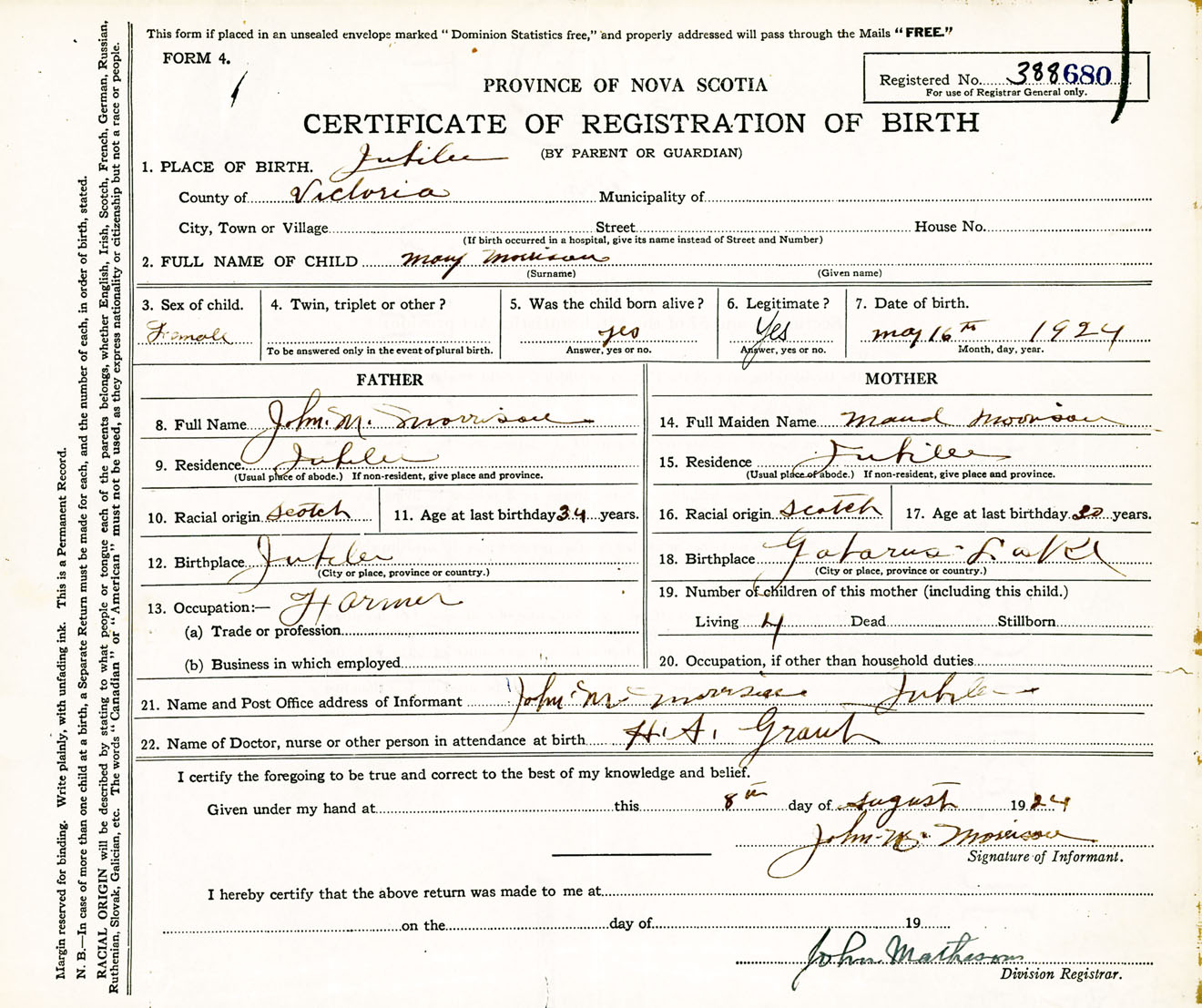 Female Birth Registration: Year: 1924 number: 38800680