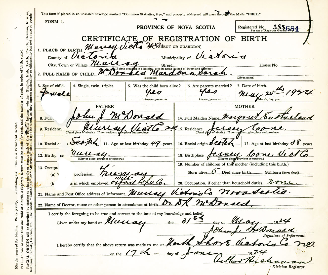 Female Birth Registration: Year: 1924 number: 38800684