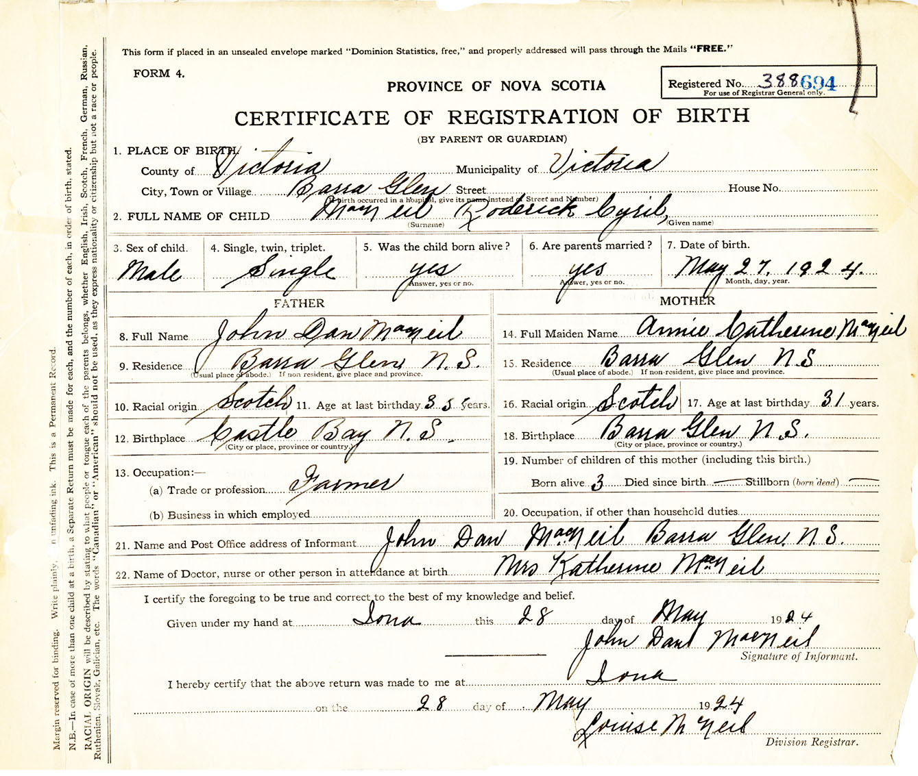 Male Birth Registration: Year: 1924 number: 38800694