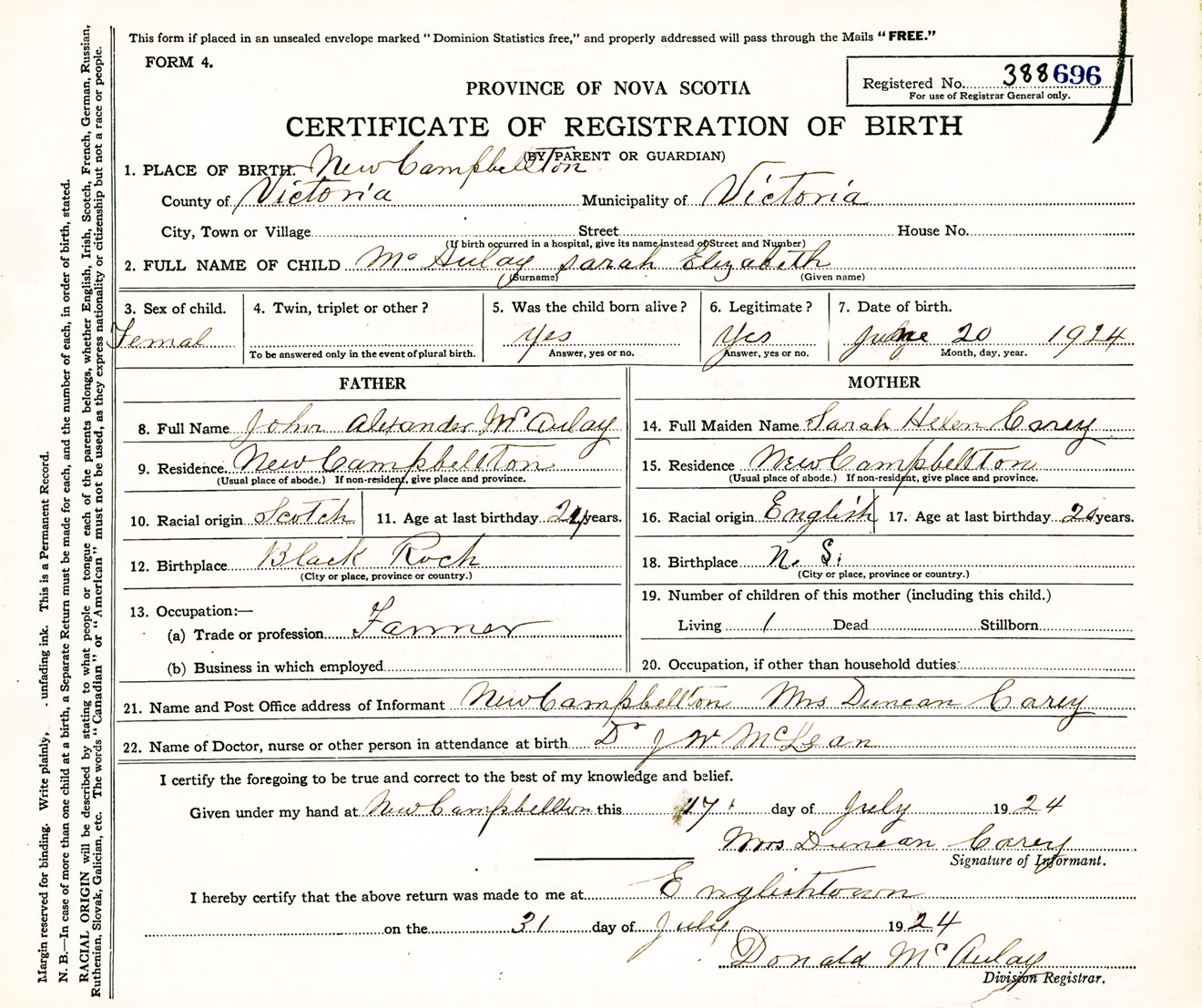 Female Birth Registration: Year: 1924 number: 38800696