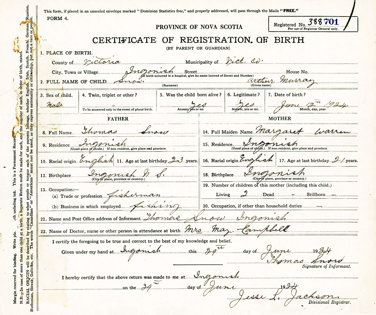 Male Birth Registration: Year: 1924 number: 38800701