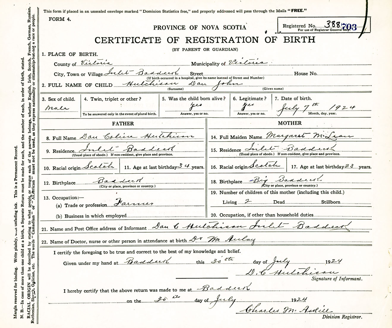 Male Birth Registration: Year: 1924 number: 38800703