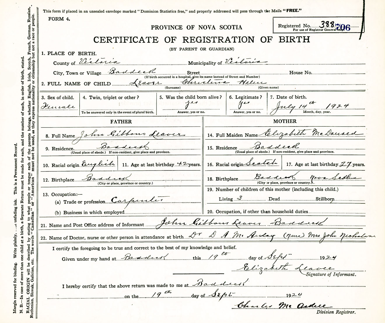 Female Birth Registration: Year: 1924 number: 38800706