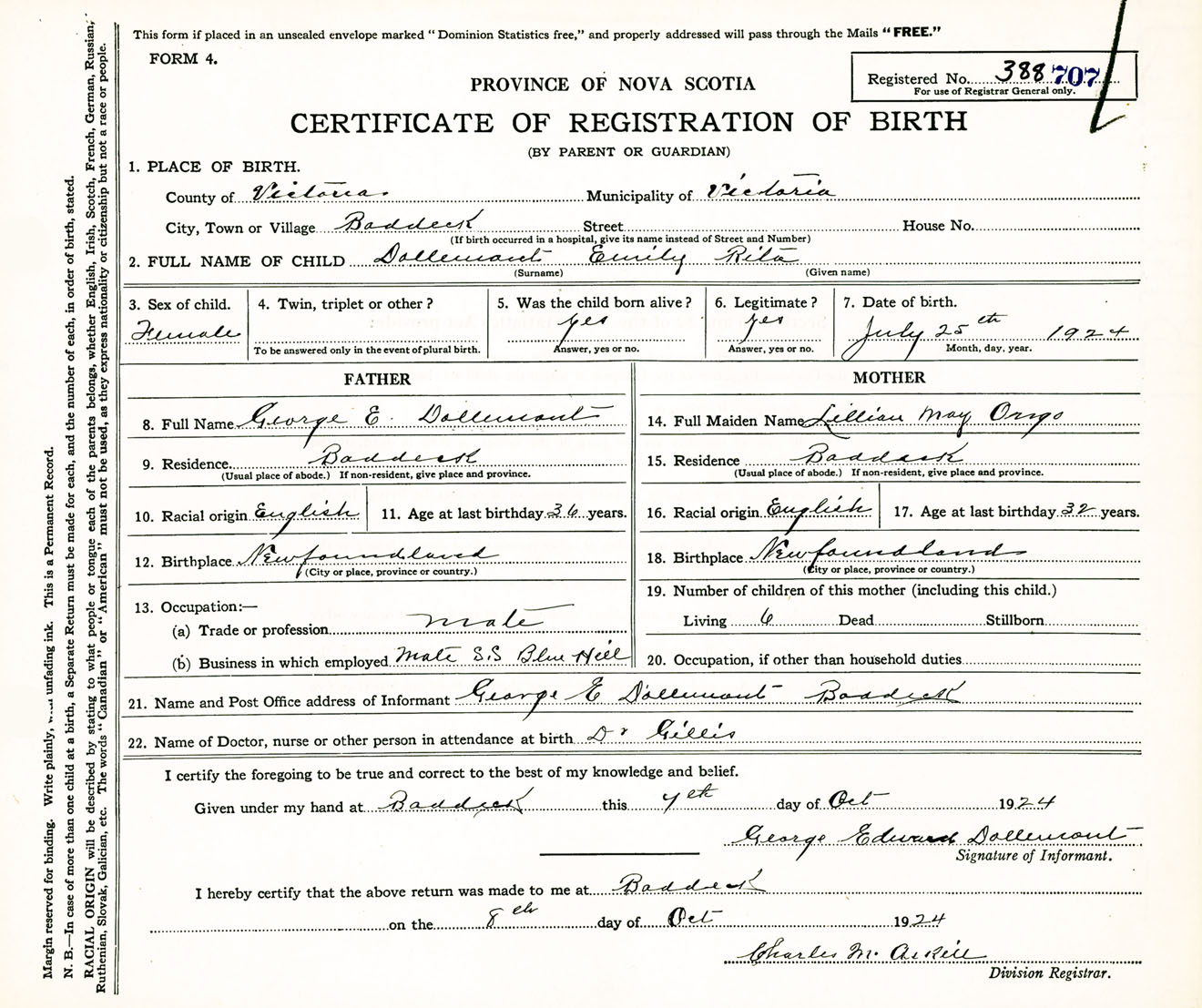 Female Birth Registration: Year: 1924 number: 38800707