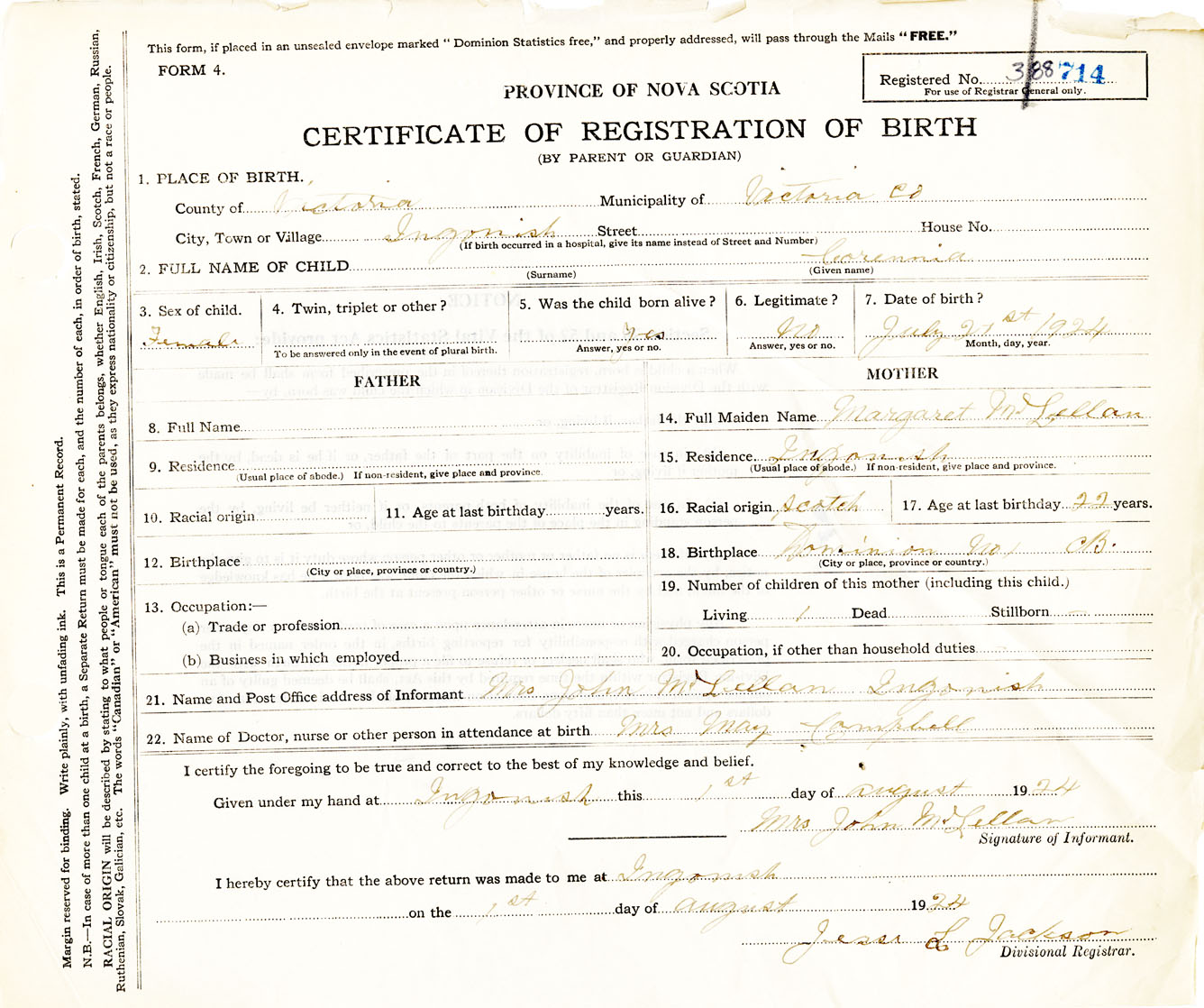 Female Birth Registration: Year: 1924 number: 38800714