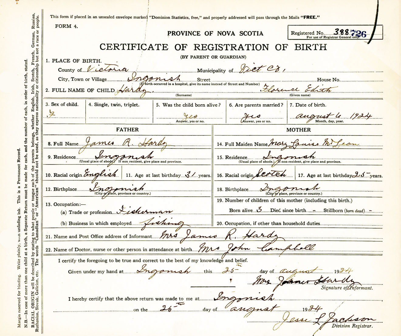 Female Birth Registration: Year: 1924 number: 38800726