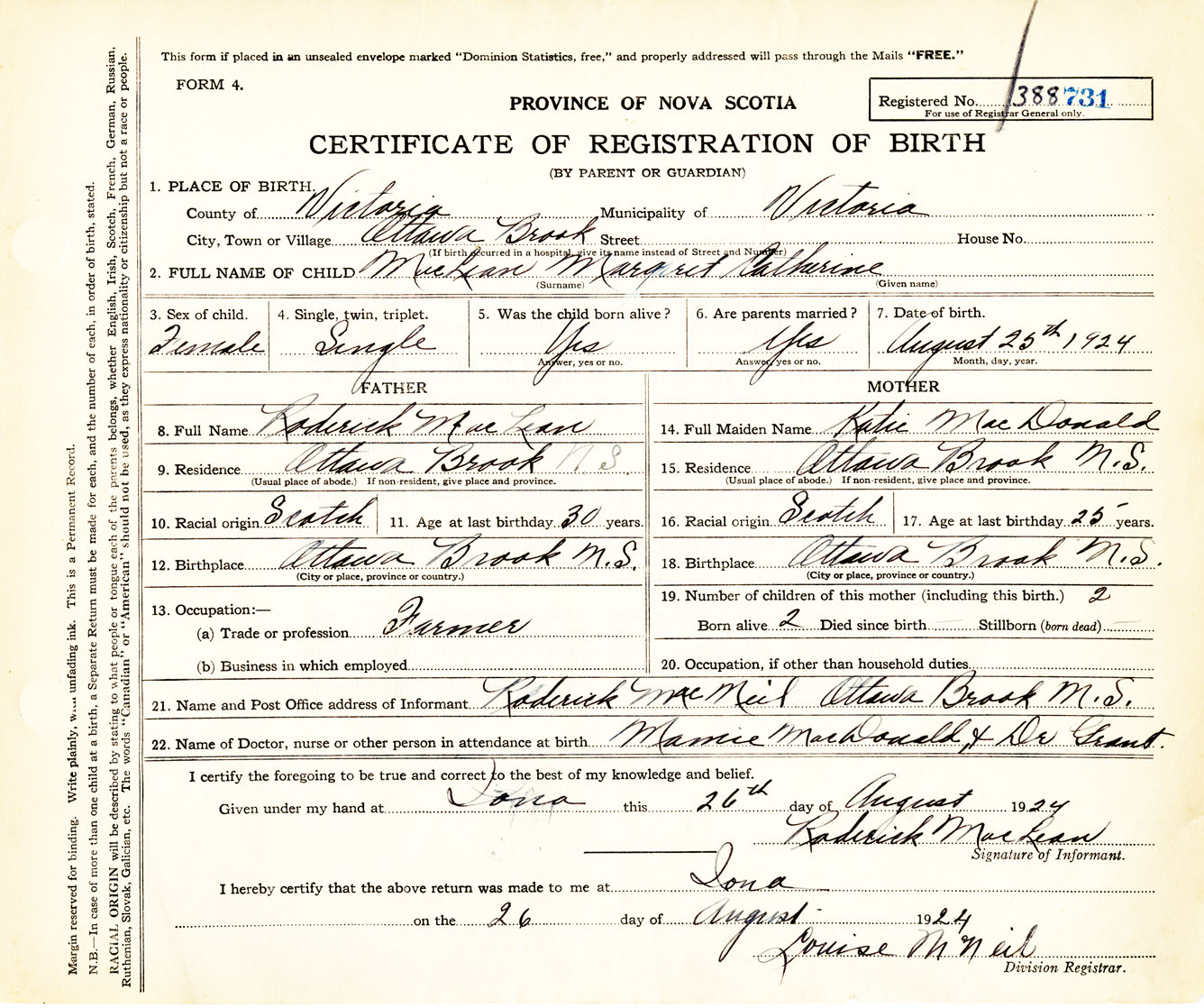 Female Birth Registration: Year: 1924 number: 38800731