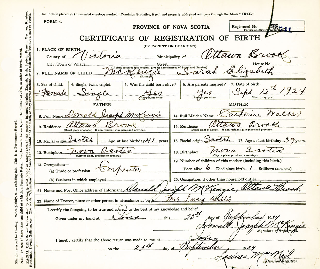 Female Birth Registration: Year: 1924 number: 38800741