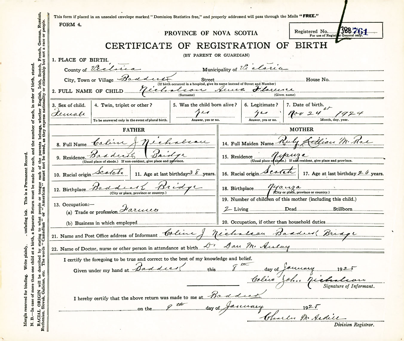 Female Birth Registration: Year: 1924 number: 38800761