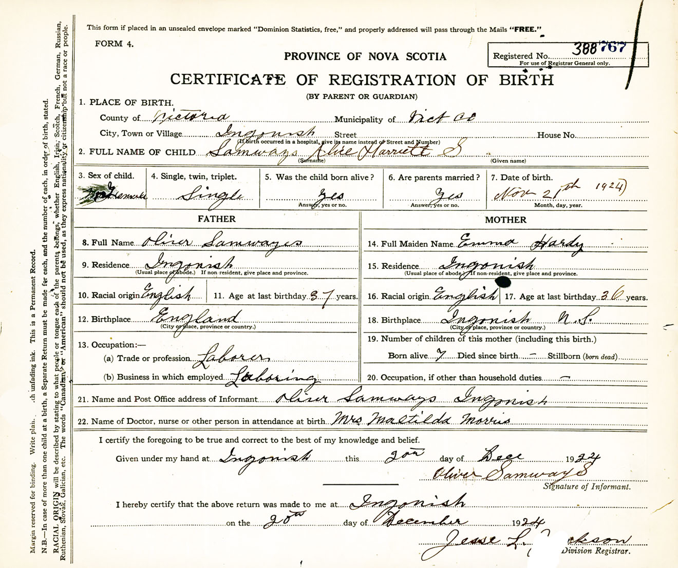 Female Birth Registration: Year: 1924 number: 38800767