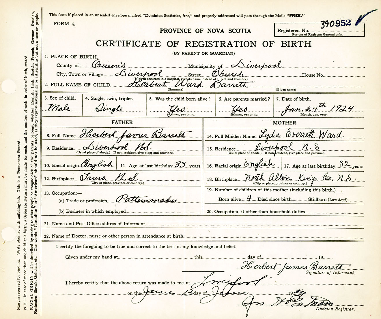 Male Birth Registration: Year: 1924 number: 39000952
