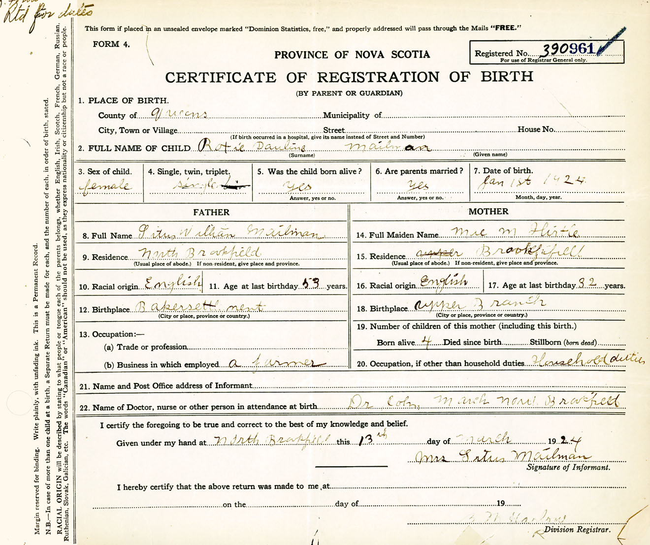 Female Birth Registration: Year: 1924 number: 39000961