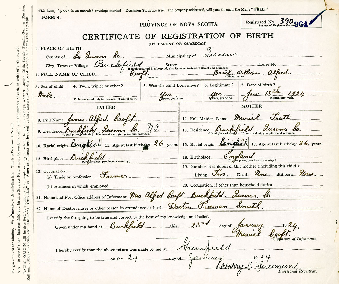 Male Birth Registration: Year: 1924 number: 39000964
