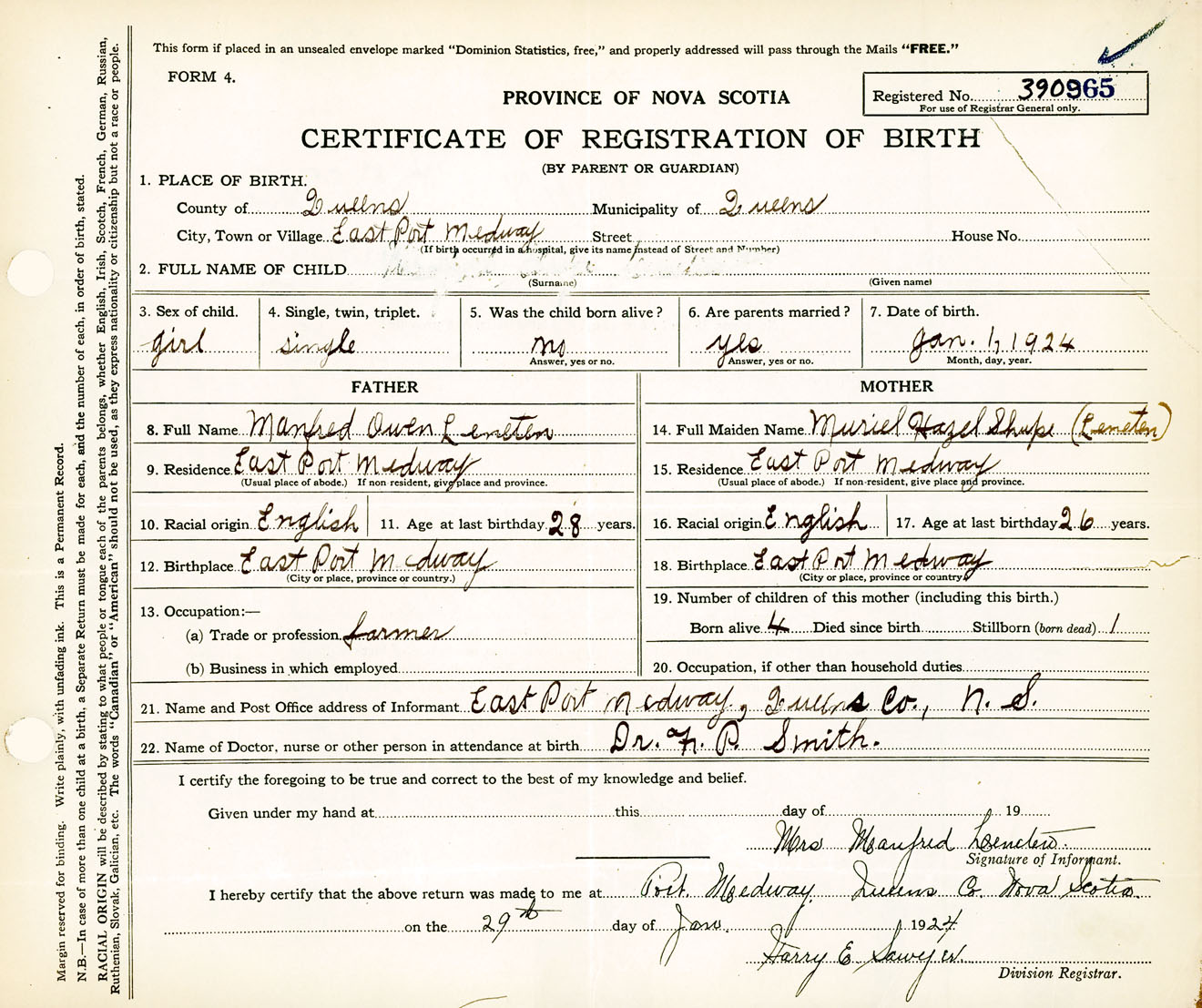 Female Birth Registration: Year: 1924 number: 39000965