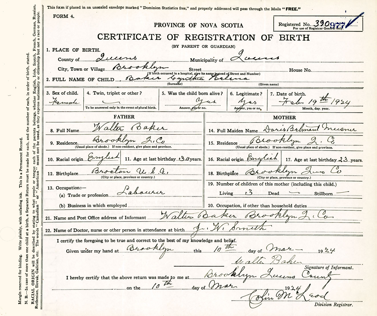 Female Birth Registration: Year: 1924 number: 39000977