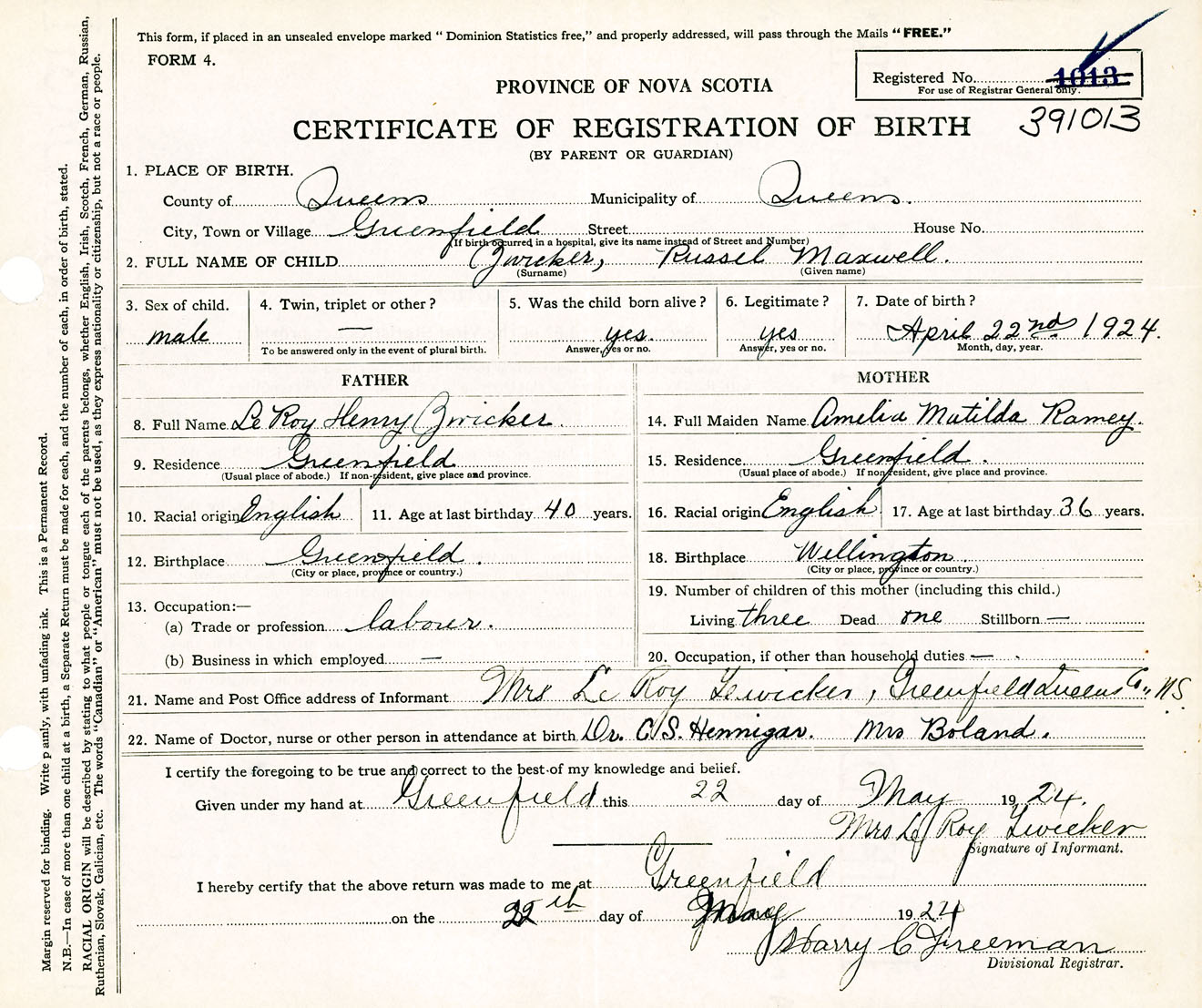 Male Birth Registration: Year: 1924 number: 39100013