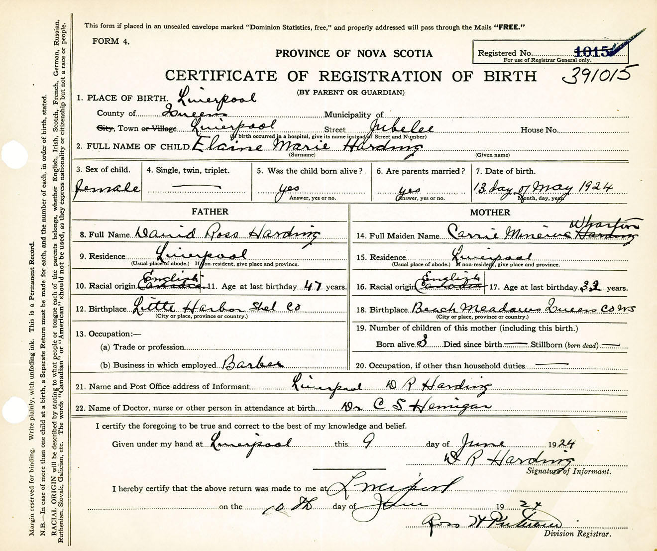 Female Birth Registration: Year: 1924 number: 39100015