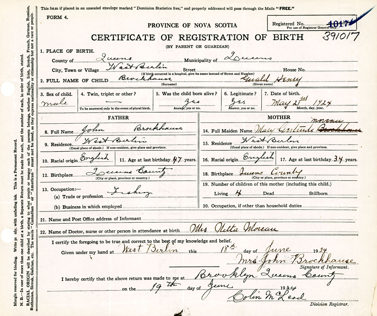 Male Birth Registration: Year: 1924 number: 39100017