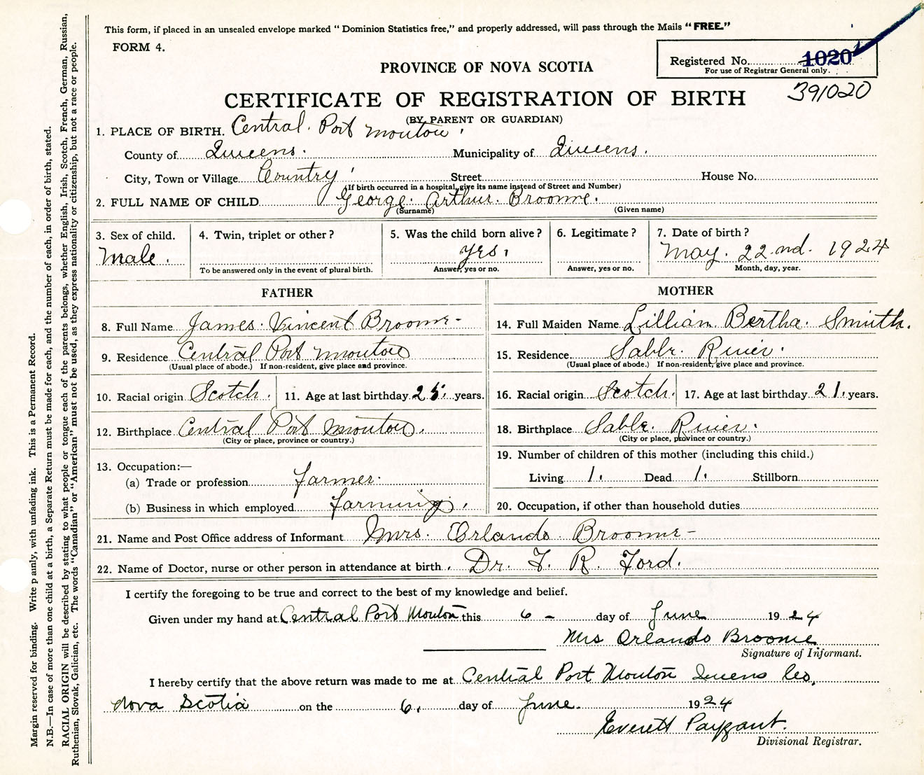 Male Birth Registration: Year: 1924 number: 39100020