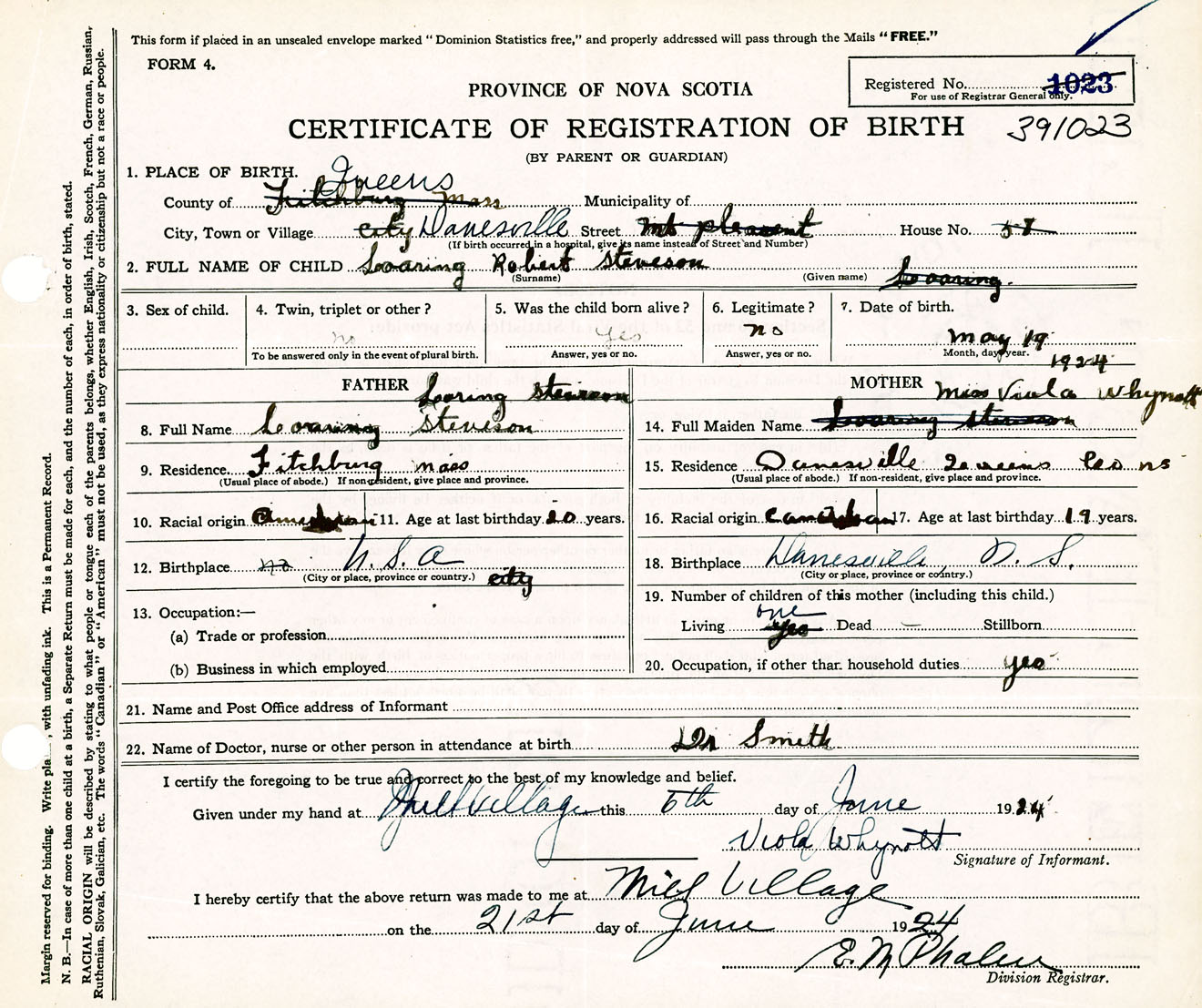 Male Birth Registration: Year: 1924 number: 39100023