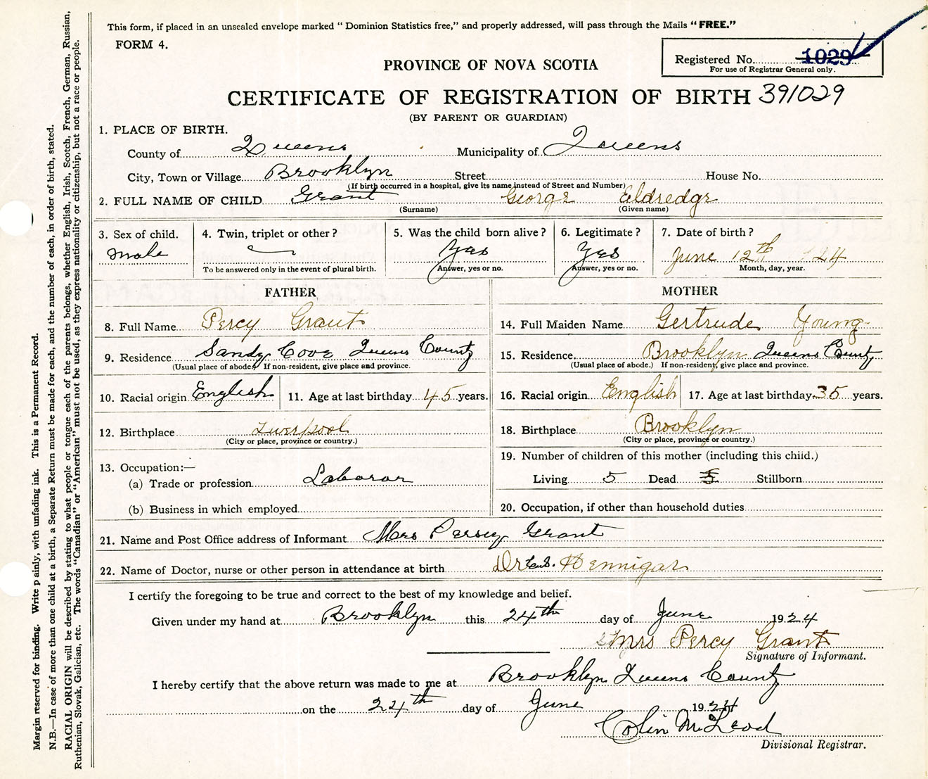 Male Birth Registration: Year: 1924 number: 39100029