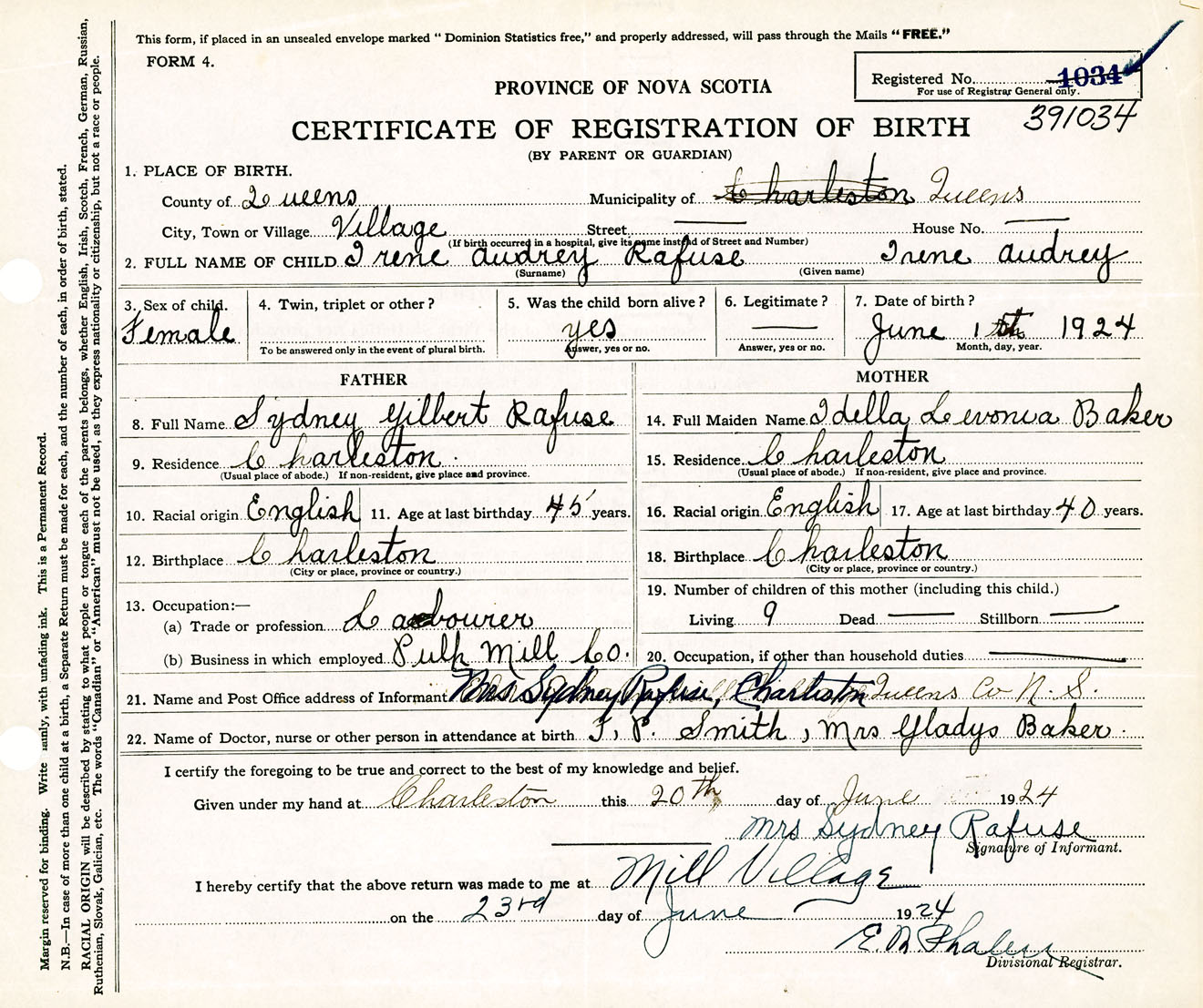 Female Birth Registration: Year: 1924 number: 39100034
